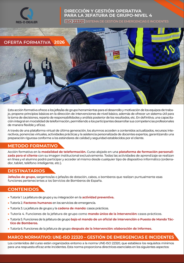 Esta acción formativa en la modalidad de teleformación, de 120 horas de duración, pretende ofrecer herramientas al Jefe de Dotación para el desarrollo y motivación de los equipos de trabajo, propone principios básicos en la dirección de intervenciones en emergencias de nivel básico, además de ofrecer una sistemática útil para la toma de decisiones, reparto de responsabilidades y análisis posterior de los resultados, sugerencias en la elaboración de informes y gestión administrativa, y actividades de inspección y prevención adaptadas a sus cometidos.